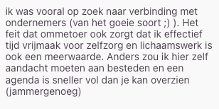 Een warme community waar ik groei als mens én als ondernemer. Ik leerde er dat kiezen voor m'n zaak, ook mogen kiezen voor mezelf betekent. Ik kon er terecht met kwetsbare verhalen én uitdagingen als ondernemer en net dat bracht me vooruit.